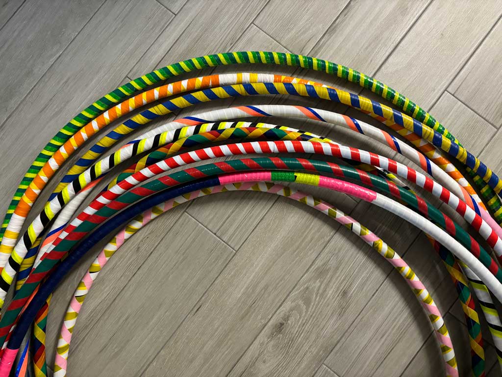This package includes 10 Hippy Hoops of varying colors, patterns, and sizes. The rental period is for 24 hours. Free delivery and pickup are included for Jupiter, FL residents. Select “Customer Pickup & Return” and rent them for a flat fee of $75 no matter where you live as long as you pick them up and return them to us at our location.